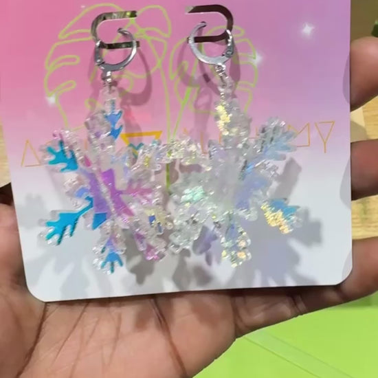 Sparkle and shine with these 3D snowflake earrings! Made from iridescent laser cut acrylic, these cute and fun earrings are sure to be a show stopper. Add a touch of whimsy to any outfit with this unique and playful accessory. Perfect for winter or anytime you want to add a little sparkle to your day! (Made with stainless steel)